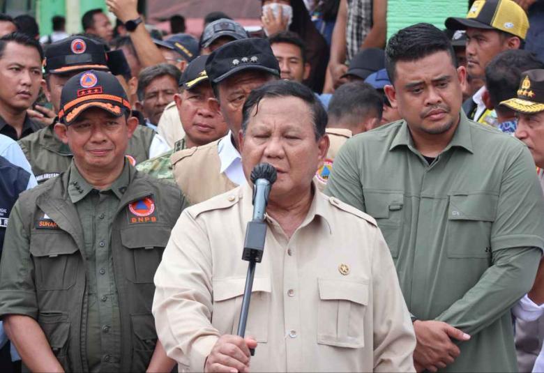 LANGKAT - Presiden RI Prabowo Subianto turun meninjau lokasi pengungsian warga terdampak banjir di MTs 1 Langkat, Tan